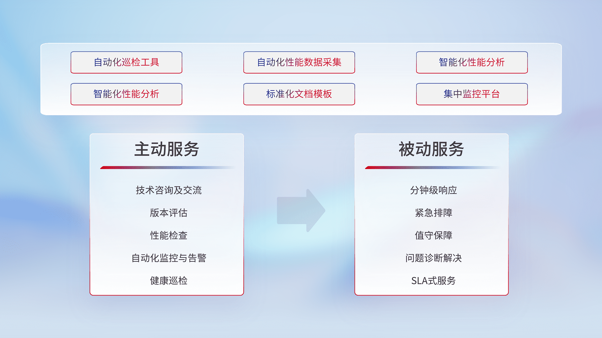 智能化工具和标准化文档,,,,保障服务质量,,,,提供主动服务(包含技术咨询、、、、版本评估、、、、性能检查、、、自动化监控与告警、、、健康巡检)和被动服务包含(分钟级响应、、、紧急排障、、值守保障、、、、问题诊断解决、、、、SLA服务)。。